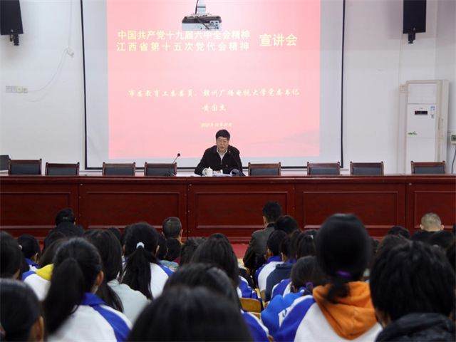 为持续掀起学习党的十九届六中全会精神热潮,深入贯彻落实全会精神,把学习好、宣传好、贯彻好全会精神作为重要的政治任务。12月21日下午,市委教育工委委员,赣州广播电视大学党委书记黄国杰同志前来我校作“学习贯彻党的十九届六中全会精神”宣讲报告,会议由学校党支部书记徐敏主持,参加聆听的有学校全体党员,中层以上领导干部,部分教师,以及21会计2班21计算机平面设计班学生。
