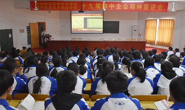 活动共有三个议程;第一个议程,赣州应用技术职业学校300余名师生在4#教学楼第一多媒体教室聆听了由赣州师范高等专科学校党员李耀榕分享的红色故事---《张富清同志先进事迹》和赣州师范高等专科学校党员钟微所作的党的十九届四中全会精神宣讲。