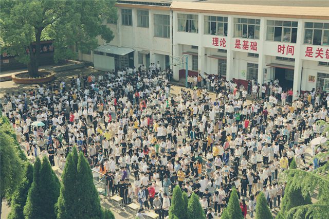 学生在实训楼前集中迎检