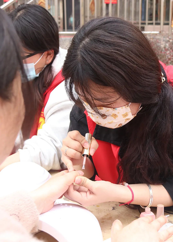 活动现场热闹非凡,设置了多个志愿服务摊位。医疗服务区内,赣州应用学校医药护理系专业志愿者们细心地为居民测量血压、血糖,耐心解答健康疑问,并给予专业的养生建议;美容服务摊位前,美容美体专业的志愿者们技法娴熟,为居民们免费制作了精美的美甲样式,提供了化妆等服务。此外,还有医保、社保和反诈知识普及宣传等服务项目,满足了居民的不同需求。