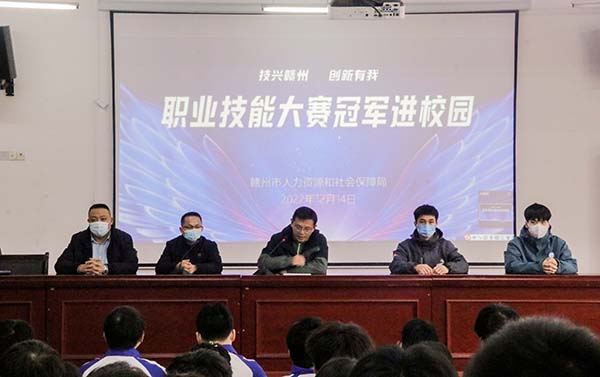 为大力弘扬劳模精神、劳动精神和工匠精神,贯彻落实《中华人民共和国职业教育法》《关于推动现代职业教育高质量发展的意见》等文件精神,2022年12月14日上午,由赣州市人力资源和社会保障局主办的“职业技能大赛冠军进校园”活动在赣州应用高级技工学校开展宣讲,赣州市就业创业服务中心副主任俞晋辉主持分享会并讲话,副校长钟宗洪和200余名师生参加。
