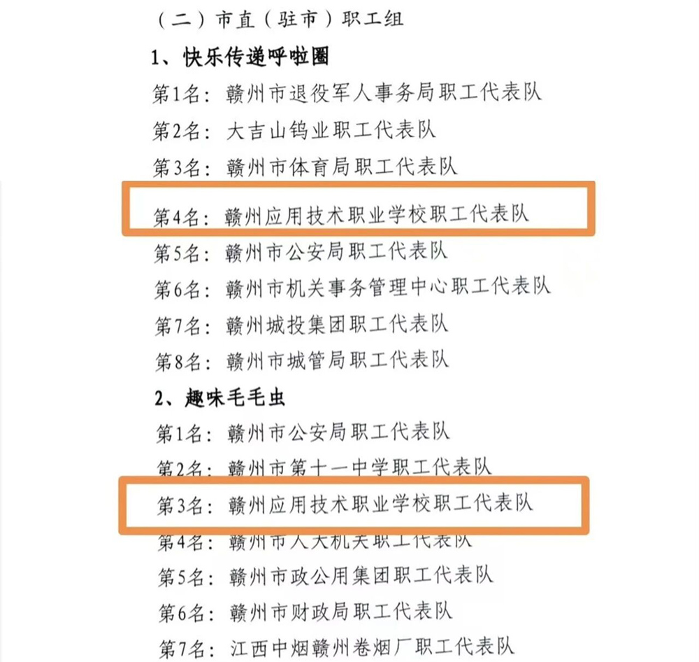 在激烈的比赛中,我校代表队展现了赣州应用技术职业学校教职工良好的精神风貌和竞技水平。在单项比赛中,我校成绩斐然: