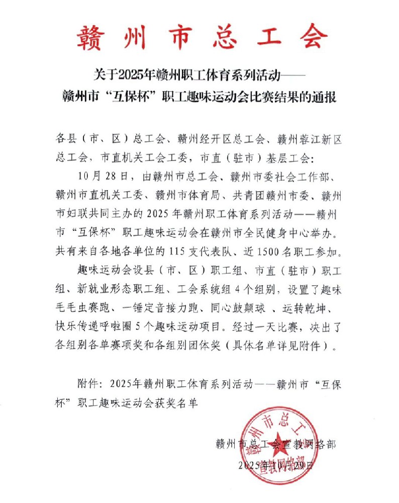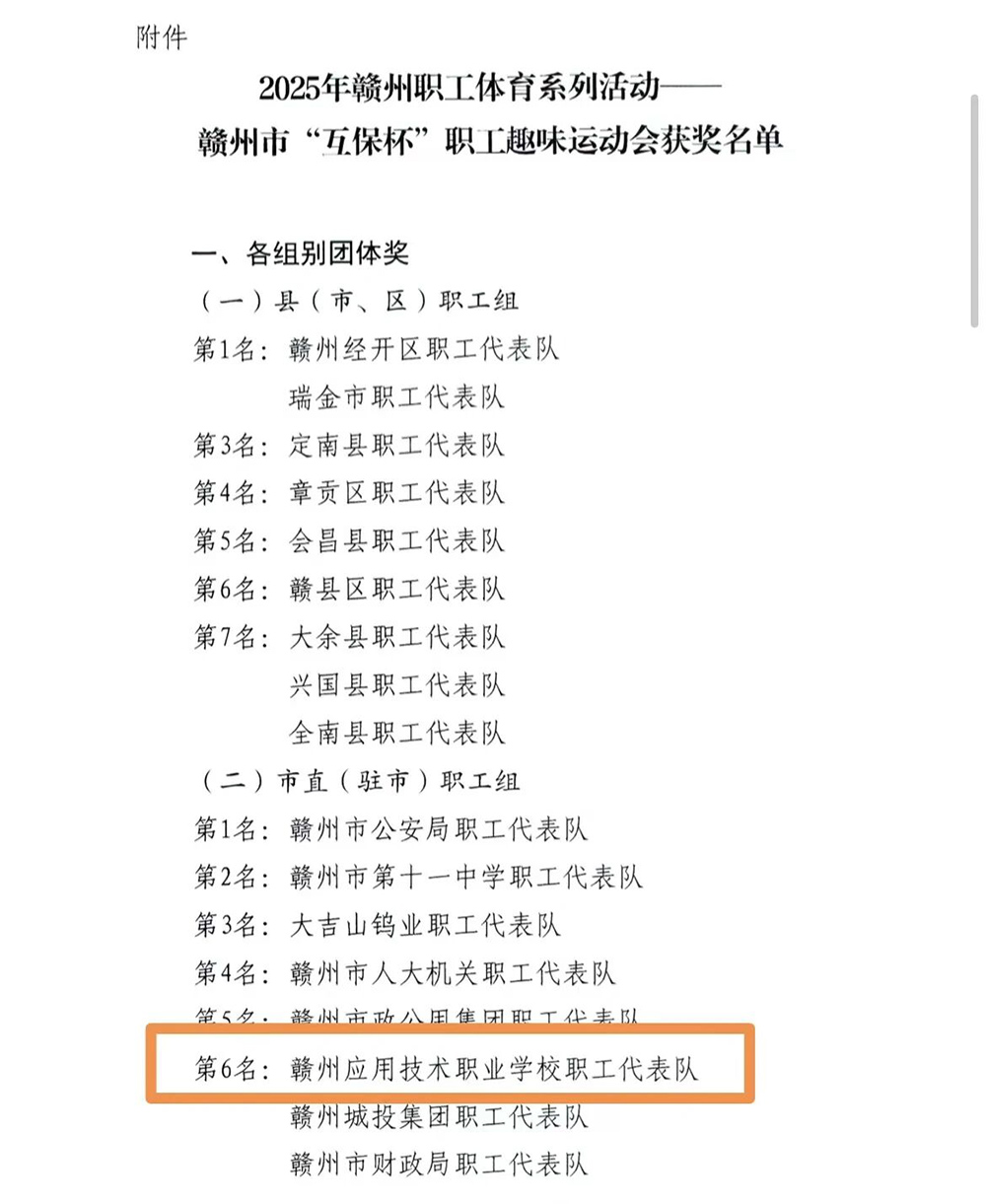 近日,赣州市总工会传来喜讯,在刚刚落幕的2025年赣州职工体育系列活动——赣州市“互保杯”职工趣味运动会上,我校职工代表队团结协作、奋勇拼搏,荣获市直(驻市)职工组团体总分第六名的佳绩!