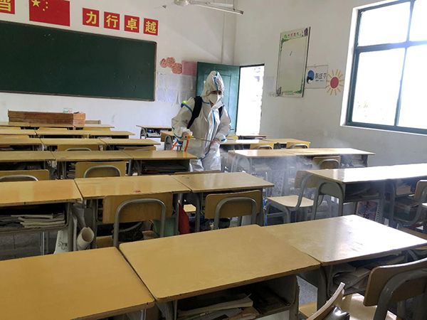 4、紧急消毒:消毒人员对发现发热、咳嗽学生的教室进行卫生清洁和消毒。