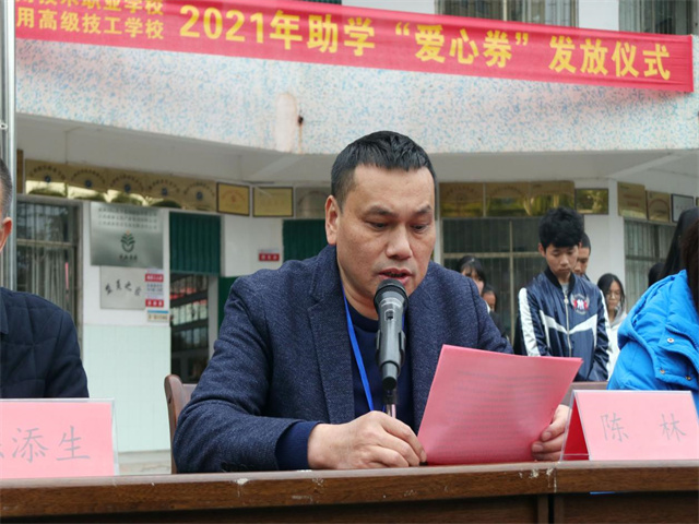 2022年1月9日下午,赣州应用技术职业学校 赣州应用高级技工学校2021年度助学“爱心券”发放仪式在综合楼前广场举行。学校校长陈林、党支部书记徐敏等校级领导及全校师生参加了仪式,仪式由童建平副校长主持。