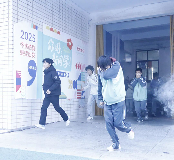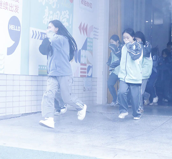 随着消防警报声响起,演练正式拉开序幕。参与演练的工作人员迅速就位,引导现场师生用湿毛巾捂住口鼻,沿着预定的疏散路线,快速、有序地撤离至指定的安全集结区域。整个过程紧张有序,疏散通道畅通,人员撤离高效。