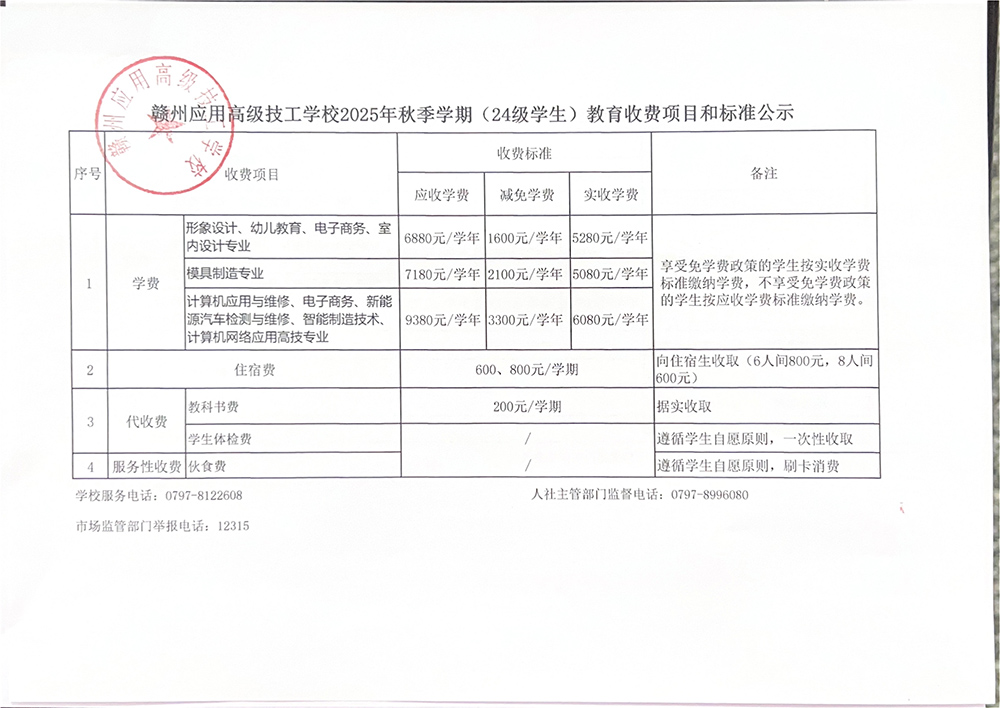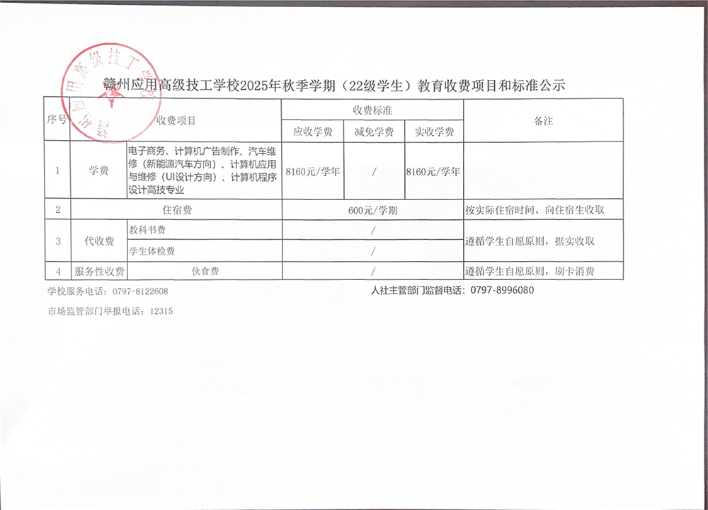 赣州应用高级技工学校2025年秋季学期教育收费项目和标准公示