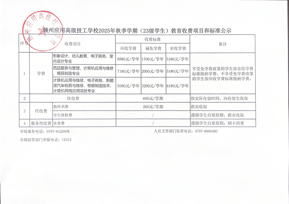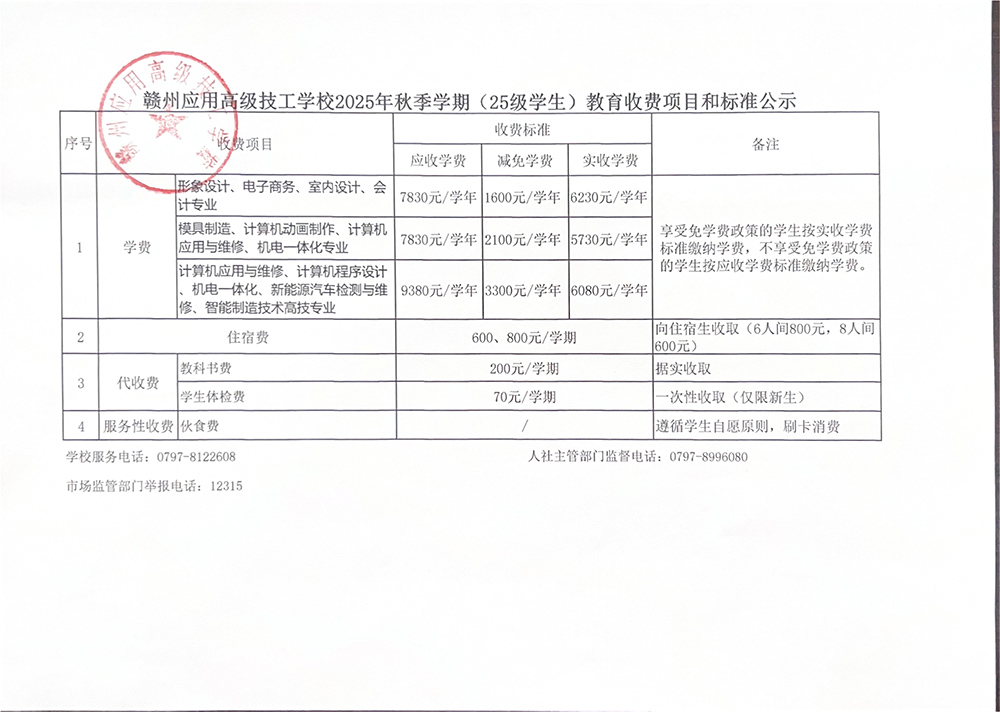 赣州应用技术职业学校2025年秋季学期教育收费项目和标准公示