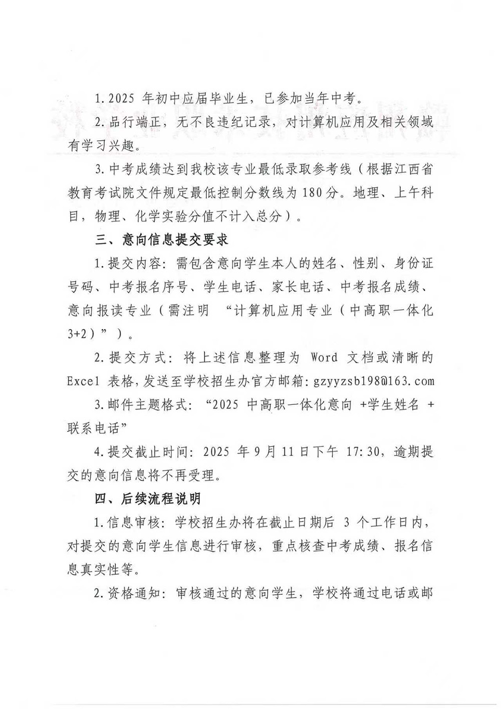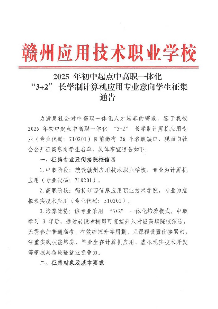 赣州应用技术职业学校 2025 年初中起点中高职一体化 “3+2” 长学制计算机应用专业意向学生征集通告