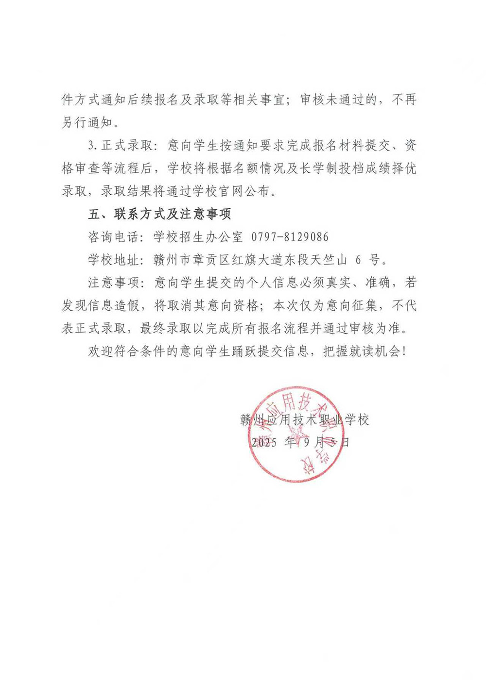 赣州应用技术职业学校 2025 年中高职一体化长学制报到截止的通知