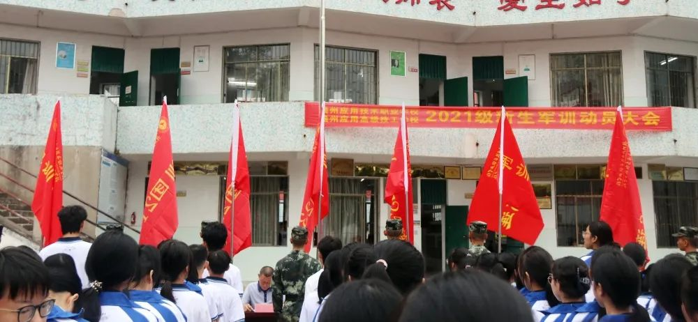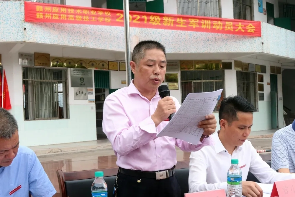 2021年10月8日上午,赣州应用技术职业学校赣州应用高级技工学校2021级新生军训动员大会在学校综合楼前坪广场隆重举行。军训承训部队教官、学校校级领导、相关部门负责人、21级班主任和全体新生参加了动员大会。本次大会由副校长童建平主持。