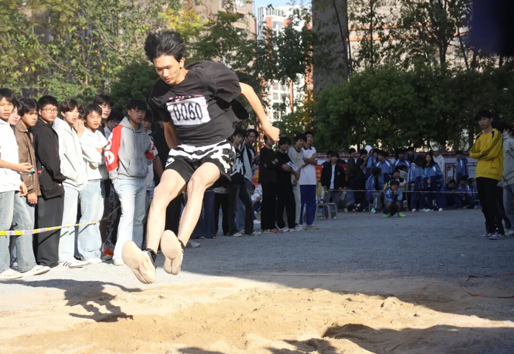 跳远赛区选手在跑道上加速冲刺奋力一跃,最终在沙坑激起阵阵沙浪。