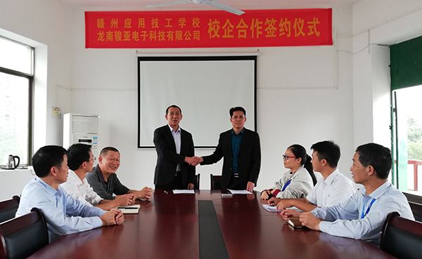 为落实赣州市人民政府办公厅《关于缓解工业园区企业招工难问题的若干措施》的文件精神和赣州市人力资源和社会保障局近期召开的关于引导全市技工学校学生到本地企业实习就业的会议精神,服务家乡经济建设,2018年10月25日下午,赣州应用技工学校与龙南骏亚电子科技有限公司在赣州应用技工学校行政会议室隆重举行校企合作签约仪式。双方就合作形式和学生实习达成了共识。