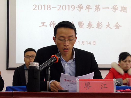 2019年1月14日上午,我校2018-2019学年第一学期年度工作总结暨表彰大会在四号教学楼二楼多媒体教室召开。校长陈林,执行校长陈添生,副校长万德星、曾小能、廖江、童建平及全体教职工参加了本次大会。会议由副校长廖江主持。