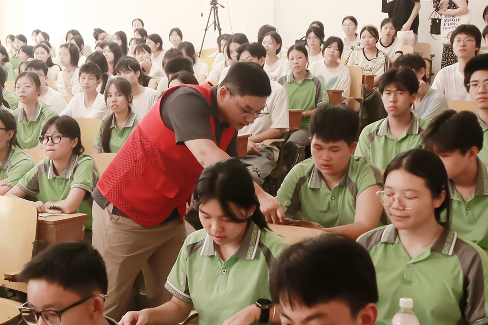 泥湾里社区工作人员分发反诈宣传手册,现场学生积极参与。